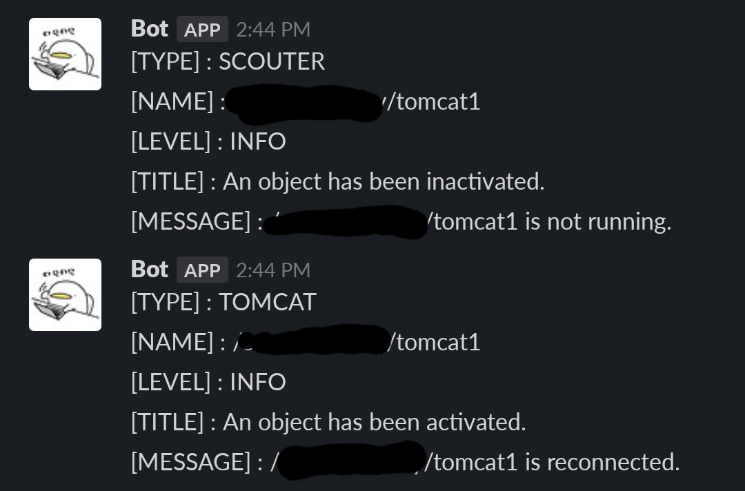 설정을 마친 후 스카우터를 재시작하면 슬랙 플러그인이 설정된 값에 따라 실행된다.